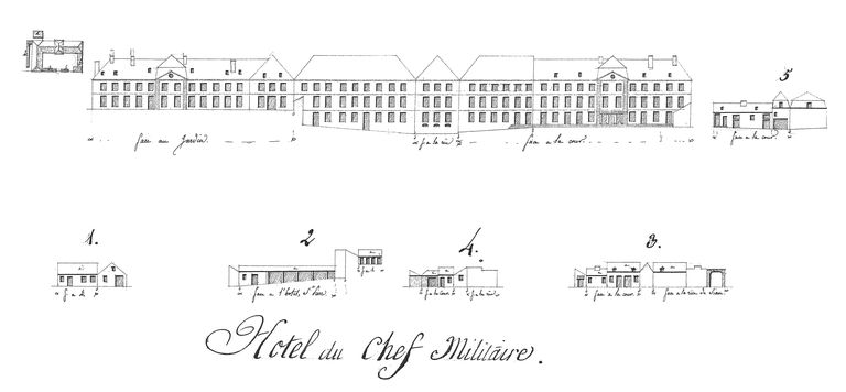 Elévations des établissements maritimes du port de Brest, année 1807. Hôtel du Chef militaire (face au jardin, face à la rue, face à la cour). Divers bâtiments (face à l'hôtel Saint-Pierre ; face à la rue de Siam). Plan d'ensembleImmatriculation