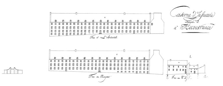 Développements des forts du camp retranché et des batteries de la côte du nord, année 1807. Caserne d'Infanterie marquée O à Recouvrance (face à l'Archantel, face au rempart)Immatriculation