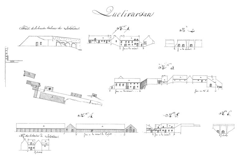 Développements des forts du camp retranché et des batteries de la côte du nord, année 1807. Quelivarzan [Quéliverzan], plan d'ensemble. Extrémité de la branche tombante. Bâtiments n° 1 à 6 (face à la rivière). Maison sur la hauteur de QuéliverzanImmatriculation