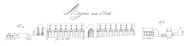 Suite des établissements maritimes, côté de Recouvrance, année 1807. Magasin aux mâts (face à la rivière). Petits bâtiments n° 1 et n° 2Immatriculation
