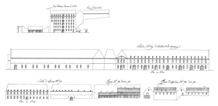 Suite des établissements maritimes, côté de Recouvrance, année 1807. Grand bâtiment derrière le n° 63. Atelier d'Artillerie et de charonnage, n° 69. Salle d'Armes, n° 70. Forges, n° 71. Forges d'Artillerie, n° 71.Immatriculation