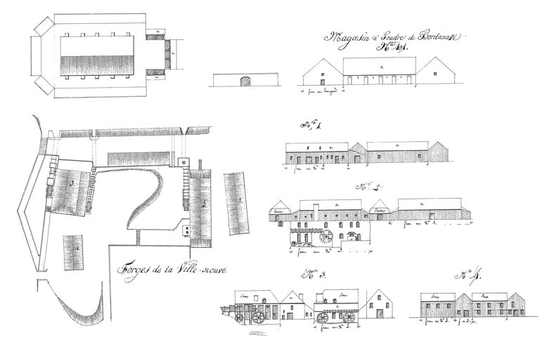 Suite des établissements maritimes, côté de Recouvrance, année 1807. Magasin à poudre de Bordenave, n° 101. Forges de La Ville-Neuve (bâtiments n° 1 à 4)Immatriculation