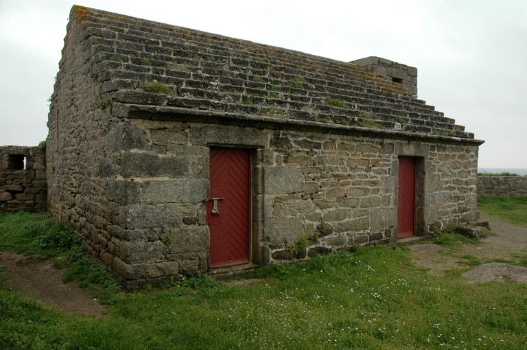 Vue du corps de garde avec magasin à poudre du côté de la terre (état en 2006). Sur le pignon du côté de la mer, souche de cheminée. Il est couvert en pierre de taille disposée en gradinImmatriculation