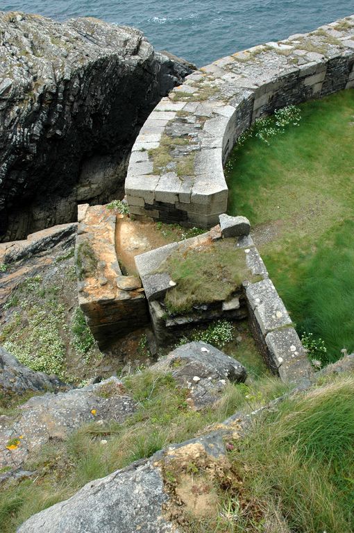 Vue de la batterie de Cornouaille : embrasure permettant le tir de flanquement le long de la falaise (4e quart 17e siècle) et abri français en moellons et dalle de couverture en béton léger (2e moitié 19e siècle)Immatriculation