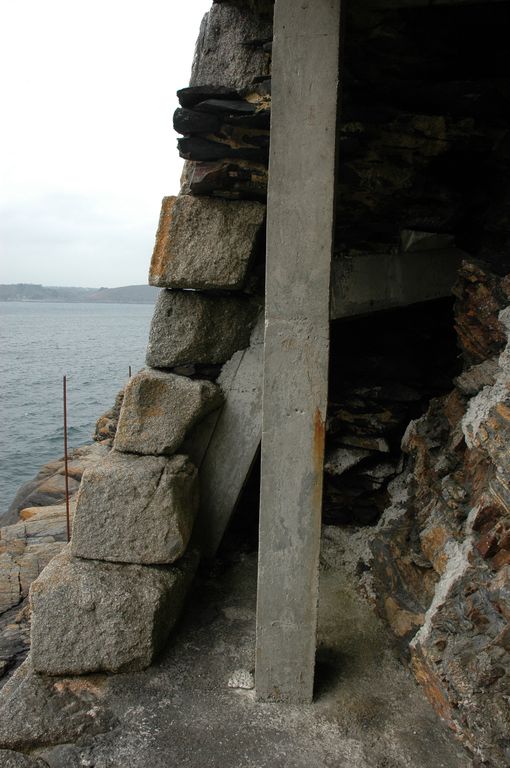 Vue de la batterie de Cornouaille : détail de l'escarpe (mur de soutènement de la batterie). Encadrement des créneaux, et cordon en granite ; remplissage en moellons de schiste (Travaux de stabilisation réalisés par la Direction des Travaux Maritimes)Immatriculation