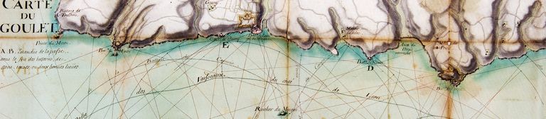 Carte du goulet de Brest, fait à Brest le 15 juillet 1695 par Vauban. A.-B. : étendue de la passe sous le feu des batteries de 5200 toises ou deux bonnes lieues. Service Historique de la Défense, Château de VincennesImmatriculation