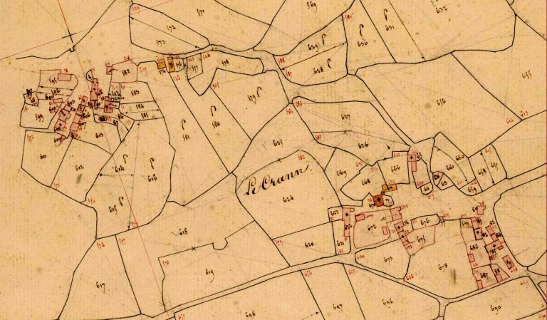La partie sud-est du village du Crann en 1836. Extrait du plan cadastral, section G 2 (A.D. Finistère, 3 P 10)Immatriculation