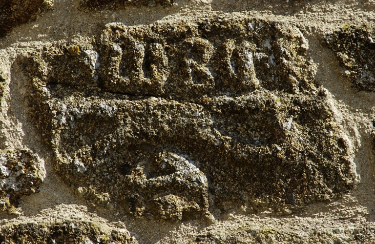 Pierre sculptée sur l'aile en retour d'équerre, marque de marchand ? et monogramme.Immatriculation