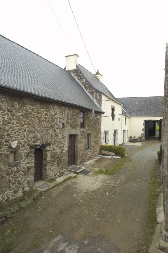 Vue de l'élévation sud-ouest des bâtiments (étable et logis) et de la grange depuis l'entrée de la courImmatriculation