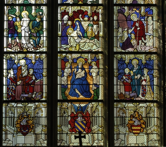 Verrière à personnages de la baie 108 (ancienne maîtresse-vitre) : Passion et Résurrection du Christ, Jugement dernier,