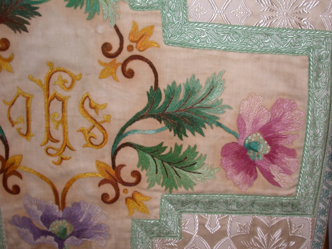 Ornement blanc 5 : chasuble, bourse de corporal, étole, manipule, voile de calice,