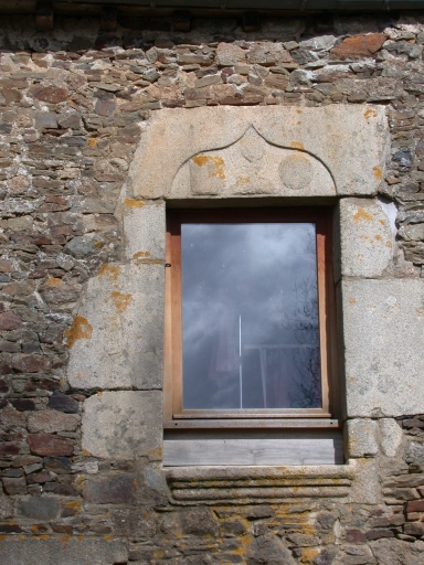 Logis 1, détail, fenêtre de l'étage, linteau avec décor de calice.Immatriculation