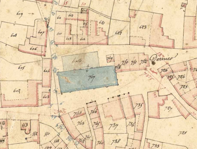 Sur le cadastre ancien, le porche est délimité par des tirets et un aplat rose au-devant du bâtiment.Immatriculation