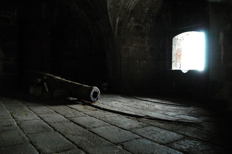 Vue du fort de la Conchée : corps de garde de la garnison dit souterrain à deux embrasures. Tube de canon (a) à chargement par la culasse.Immatriculation