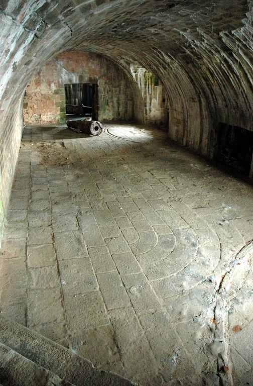 Vue du fort de la Conchée : casemate (n° 1) dit souterrain à deux embrasures. Tube de canon (b) à chargement par la culasse.Immatriculation