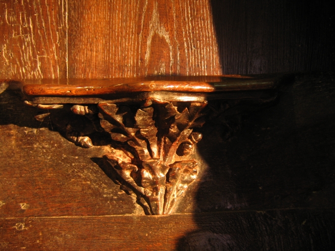 Miséricorde : ornement végétal, feuilles de chêne et glands.Immatriculation