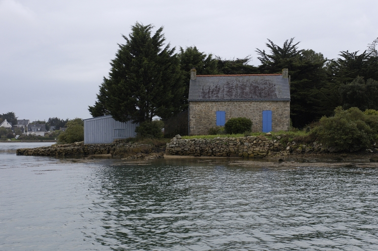 Île des Moines, maison de gardien et chantier ostréicole, vue depuis la rivière au nord. Vers 1900, le hangar est récent.Immatriculation