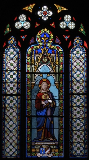 Ensemble de 9 verrières figurées : Sainte Hélène ; Saint Yves ; Immaculée conception ; Sacré-Coeur ; Saint Jean-Baptiste ; Notre-Dame de la Salette ; Saint Mathurin ; Saint Pierre ; Saint Joseph,