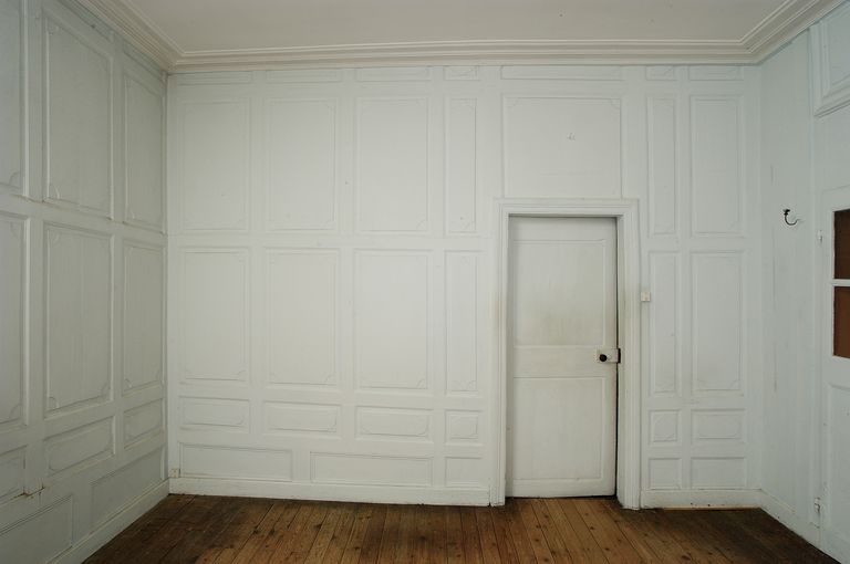Etage, chambre ouest, lambris du mur nord.Immatriculation