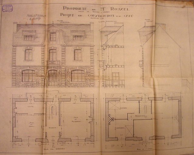 Plans du rez-de-chaussée et de l'étage, élévation antérieure, coupe transversale, par A. Charron, 22 octobre 1928. AM Vannes 5I 162.Immatriculation