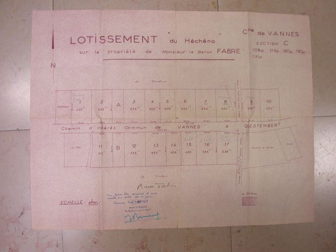Plan du lotissement du Hèchèno du baron Fabre, 1947. AM Vannes 1O221.Immatriculation