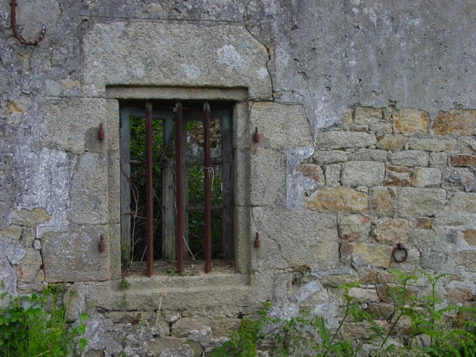 Kerorel, maison (C 787). Détail façade sud : reste d'enduit sur maçonnerie de moellons. Les entourages de baies en pierre de taille sont partiellement recouverts par l'enduit travaillé en faux appareil souligné au fer.Immatriculation
