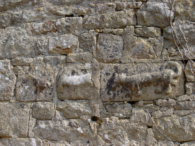 Ferme est, logis étable début 19e siècle, détail sculptures en remploi sur la façade.Immatriculation