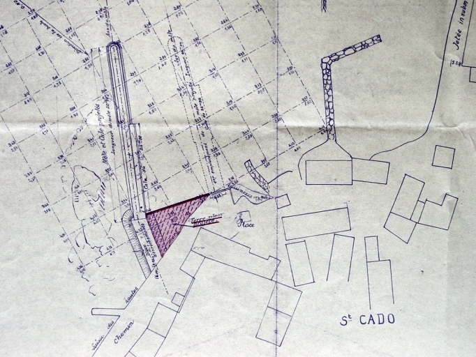 Plan du môle et de la cale de Saint-Cado. Projet de Bigot et Perret en 1929. En rose le terre-plein supplémentaire, construit en 1932.Immatriculation