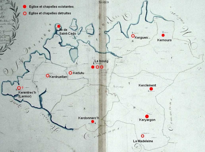 Plan de localisation des églises et chapelles sur fond de tableau d'assemblage du cadastre de 1811.Immatriculation