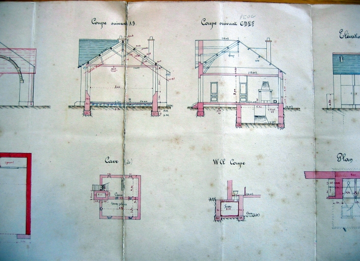 Construction d'une école mixte à Locoal : coupes, plan de la cave, modifié en bleu après délibération en 1910, puis modifié en rouge après délibération en 1911, vu et approuvé en 1912, signé Jasseron FilsImmatriculation