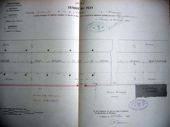 16 septembre 1884. Demande de Lotz pour enclore sa propriété, plan du 31 octobre, par C. Baum, ingénieur des Ponts. AD Morbihan S 246.Immatriculation