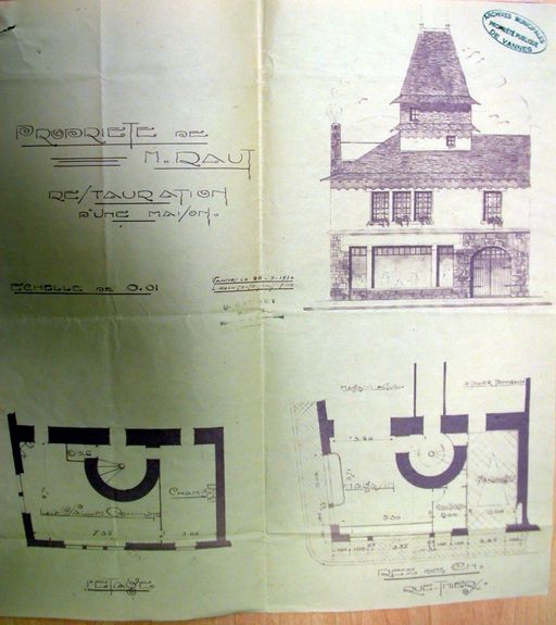Modification de la façade ouest et surélévation d'un étage pour Mr Raut, sur plans Bardet, 28 septembre 1930. AM Vannes, 1O216.Immatriculation