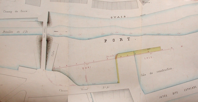 Plan : cale refaite et mur de quai en amont écroulé sur 121 m, projet de construction d'un nouveau quai, 1876-77 (AD 22)Immatriculation