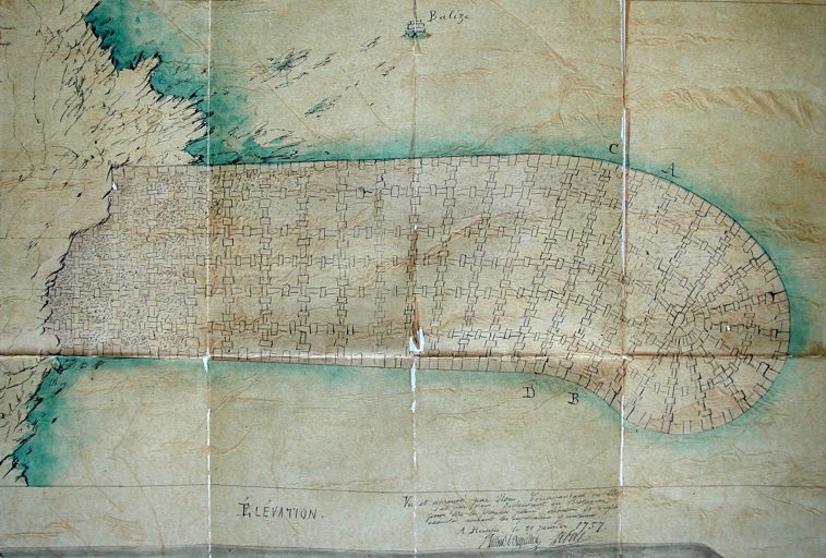 Plan daté de 1757, copie de 1876 : détail et descriptif du môle et du musoir ou crochet terminal (AD 22)Immatriculation