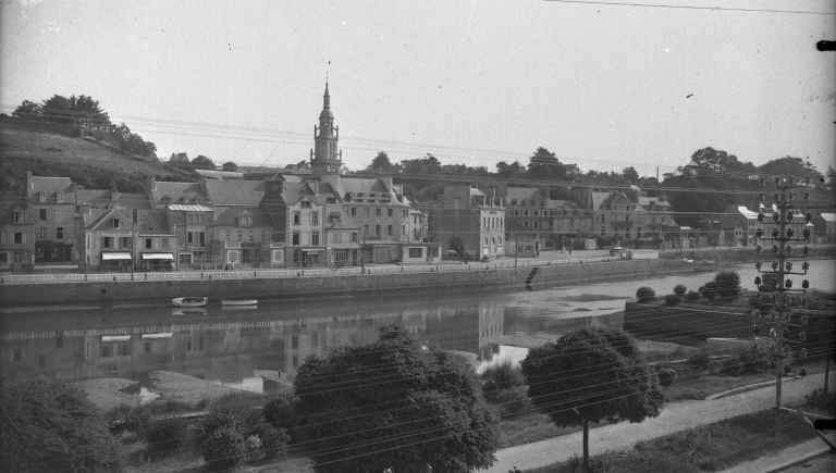 Vue générale des quais de Courcy et Jean Bart, vers 1950, avec la promenade en face ; le garde-corps a été mis en place en 1914 pour replacer les chaînes de protection : barres de fer sur poteaux en fonte, peints (AD 22)Immatriculation
