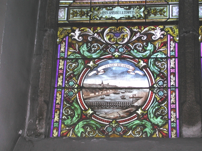 Vue de détail de la scène figurée sur le vitrail : le grand pont métallique daté de 1850Immatriculation