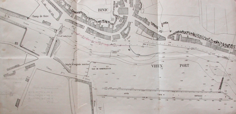 Plan du port de Binic en 1890 : remarquer le pont métallique, les anciens marais (AD 22)Immatriculation