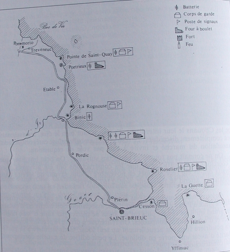 Extrait du plan de Guy Sallier Dupin (La Mer et la Révolution dans les Côtes du Nord) : plan des défenses littorales sur la côte du Goëlo, le corps de garde et la batterie de Binic (AD 22)Immatriculation