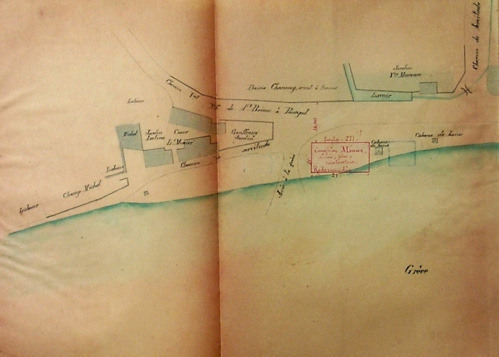 Plan daté de 1888 : concession sur la banche pour le constructeur de navires Yves Minier, à côté des premières cabines de bains et du lavoir (AD 22)Immatriculation