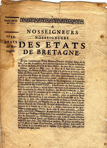 Document original adressé aux Etats de Bretagne relatif à la demande du navire Modéré de Binic pour l'exemption de droits de port en 1734 (AD 22)Immatriculation