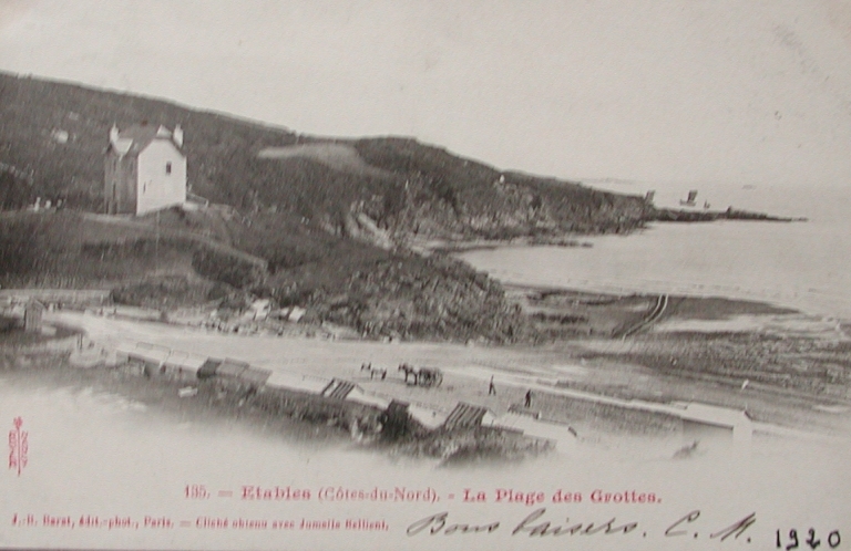 La grève du Moulin : remarquer le charroi dans la grève pour l'extraction du sable et de goémon, vers 1920 (collection particulière)Immatriculation