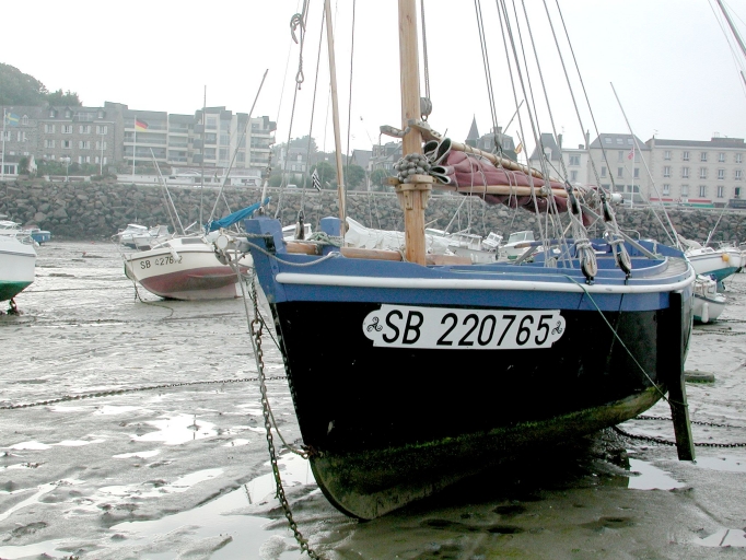 Vue des formes 3/4 de l'avant : remarquer la tonture de ce fort canotImmatriculation