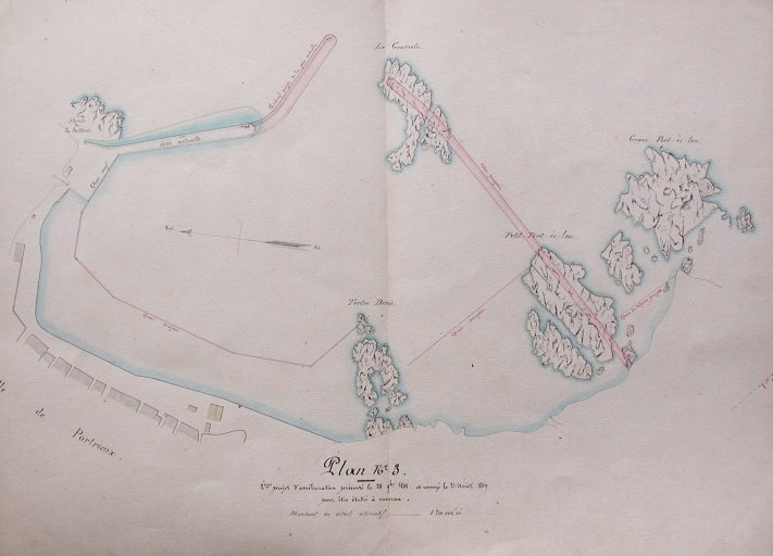 Plan n° 3 : projet d'amélioration du port présenté en 1848 et renvoyé en 1849 pour être étudié de nouveau, projet d'allonger la jetée principale ouest et d'une nouvelle jetée à Pors Es Leu (AD 22)Immatriculation