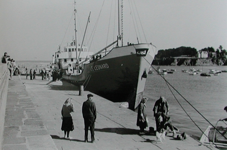 Vue du caboteur Le Léonard, à quai au Portrieux, déchargeant sa cargaison pour les Cimenteries réunies et le négociant Thomas, vers 1960-64 (collection particulière)Immatriculation