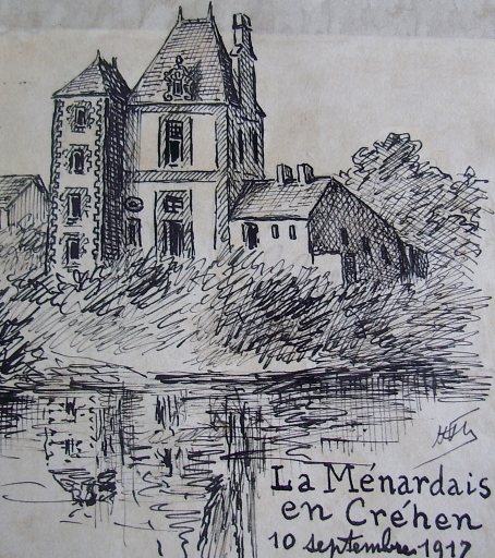 Vue générale du manoir de la Ménardais (détruit), croquis du vicomte Henri Frotier de La Messelière, 10 septembre 1917 (AD 22)Immatriculation