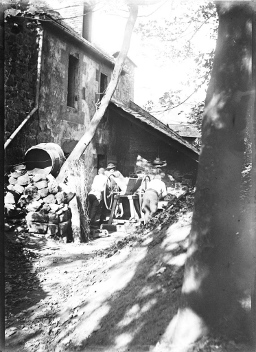 Créhen, fabrication du cidre vers la fin du 19ème siècle, broyage des pommes, par Alain Raizon du Cleuziou (coll. Raison du Cleuziou, AD 22)Immatriculation