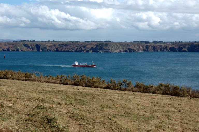 Vue générale du goulet de Brest depuis la batterie extérieure de 100 mm du Mengant : côte de Cornouaille, Roscanvel, presqu'île de Quélern. La batterie de CornouailleImmatriculation