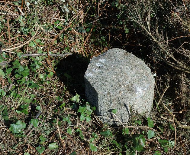 Vue d'une borne en granite délimitant l'emprise du terrain militaire (état en 2007)Immatriculation