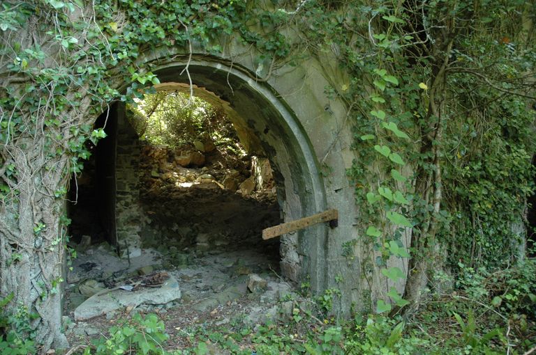 Vue du magasin à poudre terrassé en tranchée situé à mi-chemin entre la batterie de 24 cm et la batterie de 32 cm des Capucins construit entre 1882 et 1884 en maçonnerie recouverte de terreImmatriculation