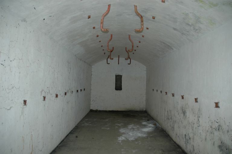 Vue de la batterie de droite des Capucins : intérieur du magasin à munitions en béton armé sous le massif de la traverse d'extrémité gaucheImmatriculation